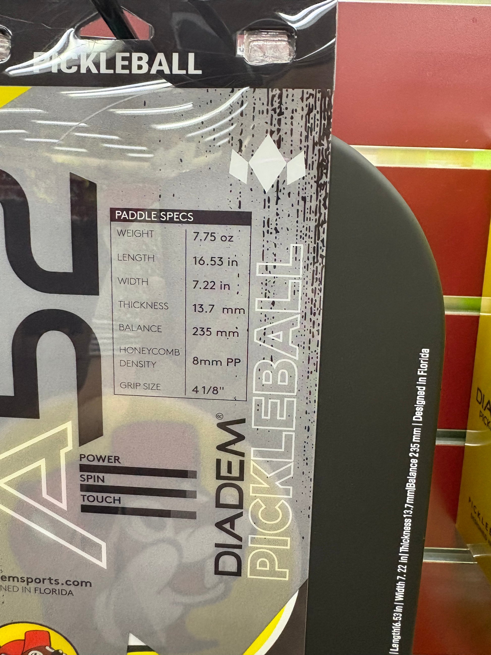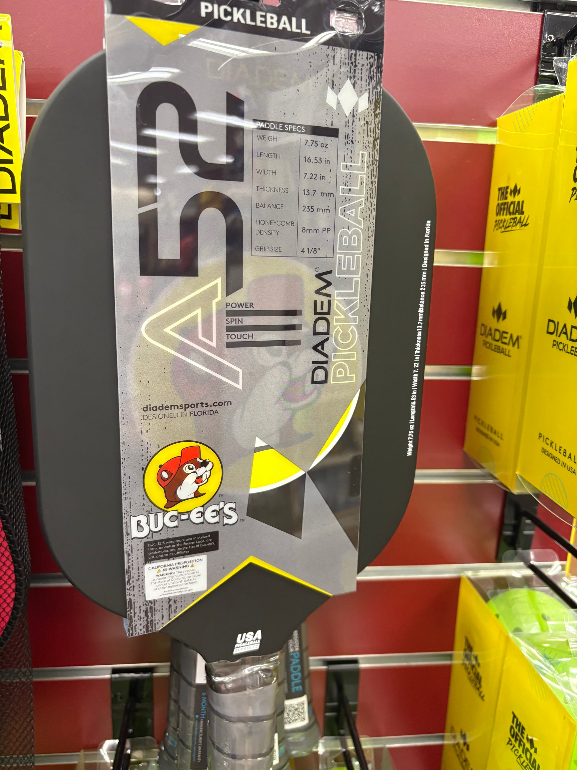 The Buc-ees Diaden A52 Black Pickle Ball Paddle features a distinctive Beaver Logo and an innovative Edgeless Design, with a 13.77 Core for added strength and durability. Expertly crafted in the USA.