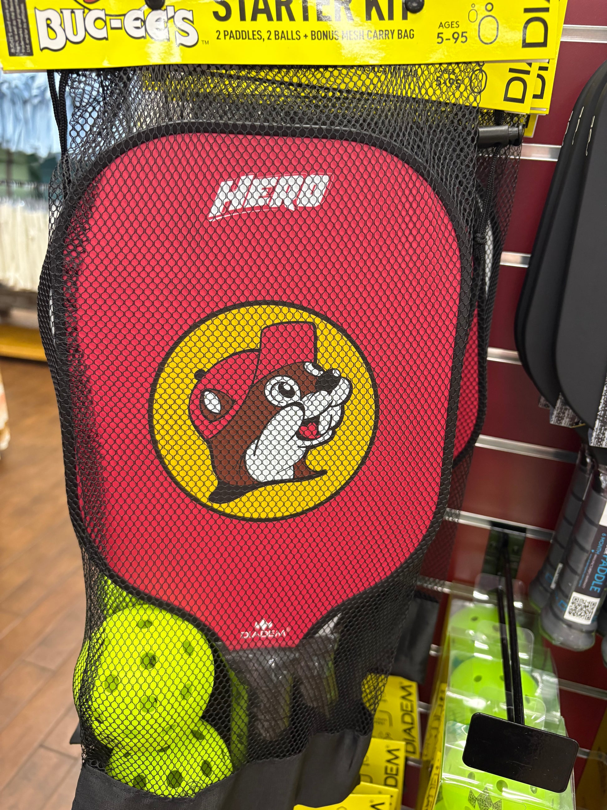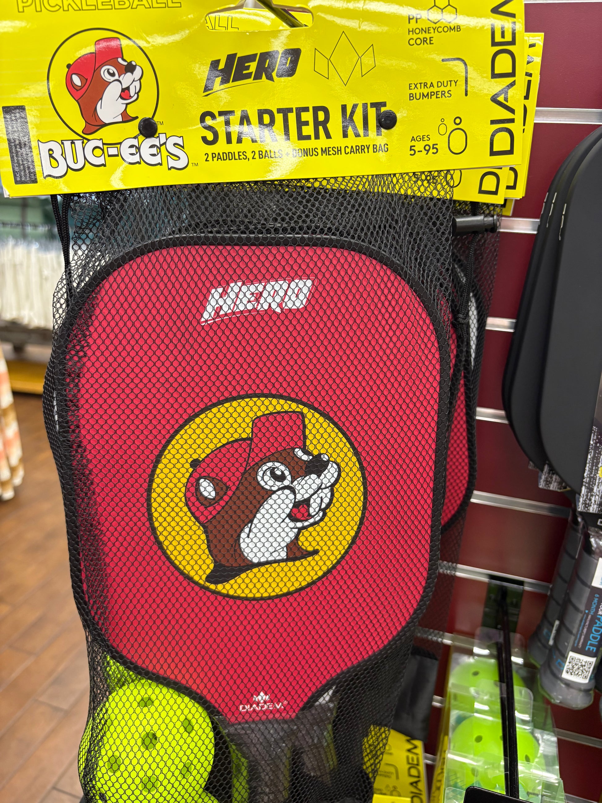 The Buc-ees Hero Brand Pickle Ball Starter Kit features the iconic Beaver Logo on 2 Paddles and 2 Pickle Balls. Crafted from durable materials, this kit promises lasting quality.