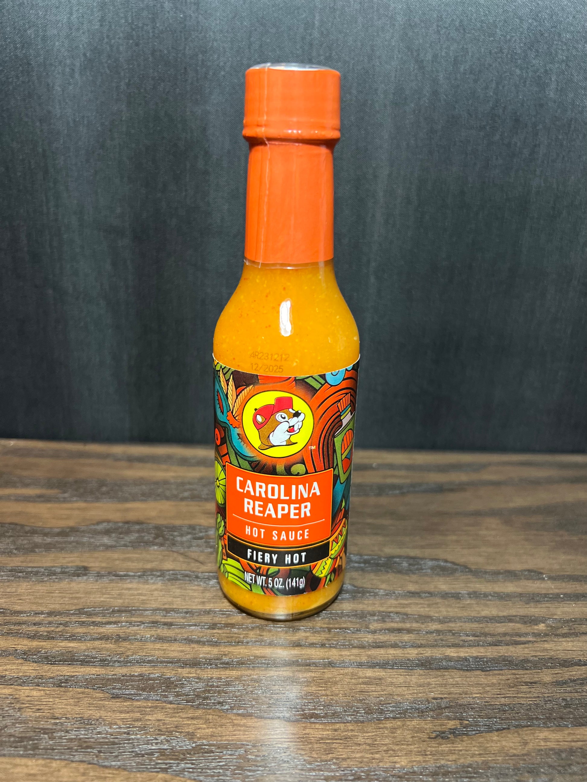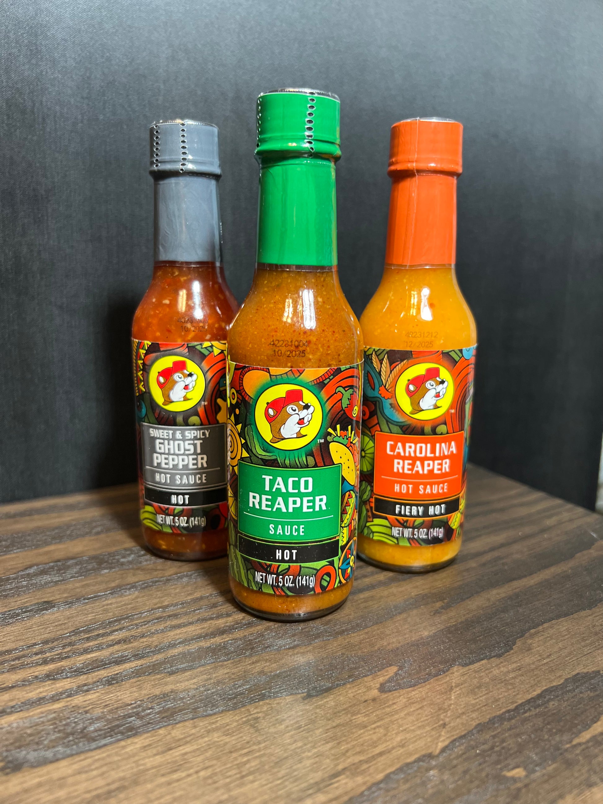 Buc-ees Hot Sauce Taco Reaper, Carolina Reaper, Ghost Pepper, Peach Habanero, and 7-POT Primo Pepper 5 oz each. Good when you need a little heat added to your meal!