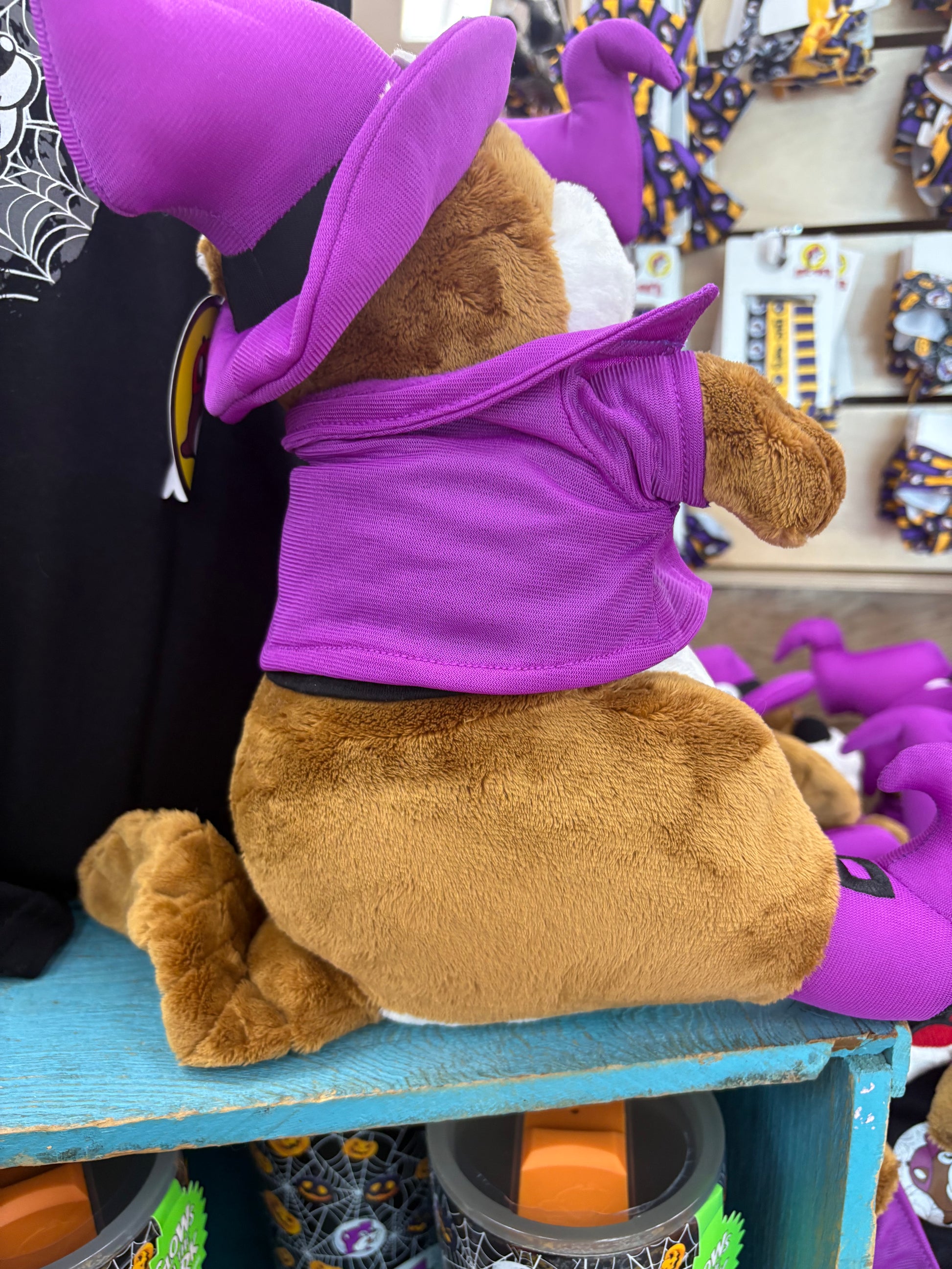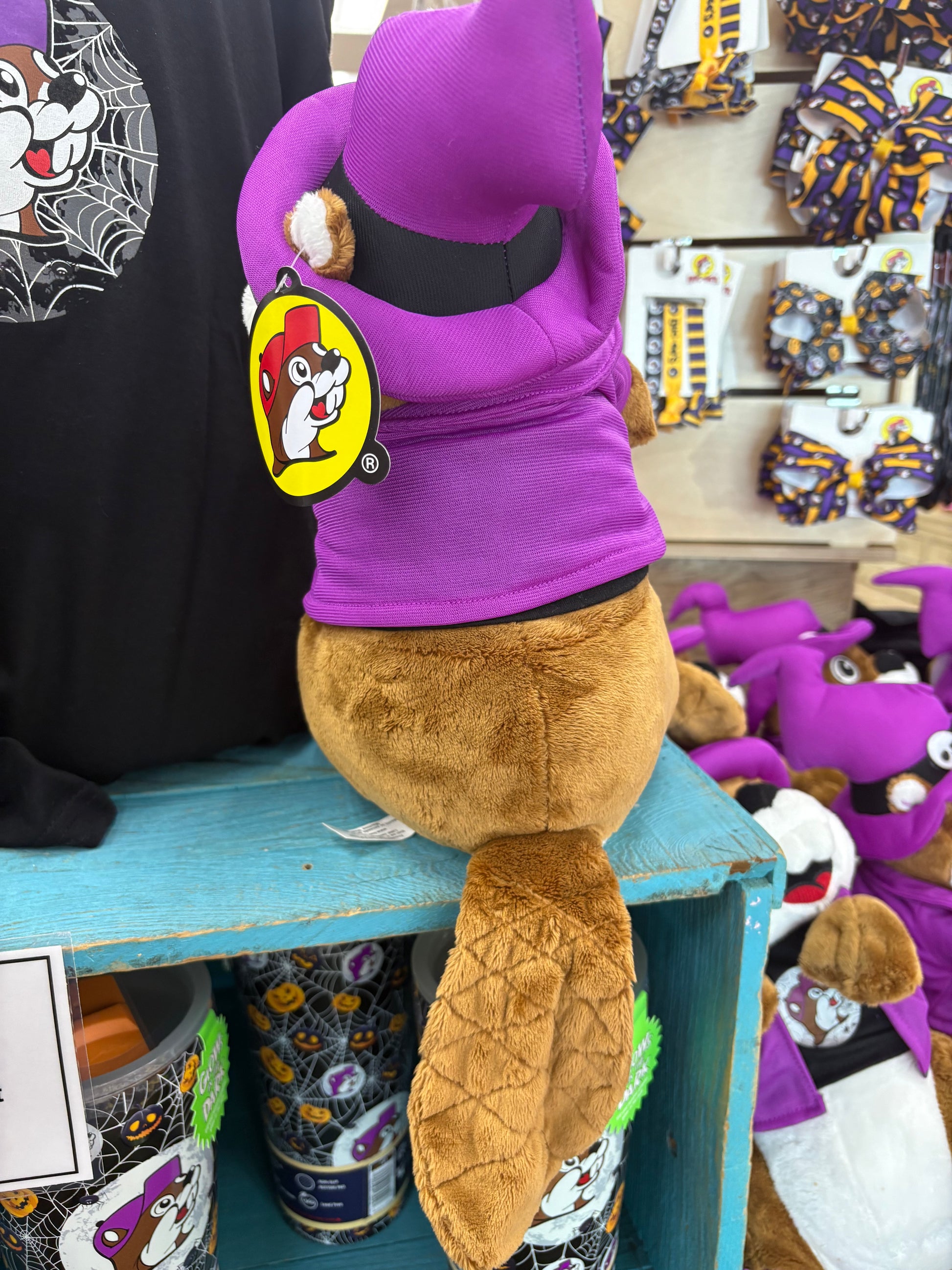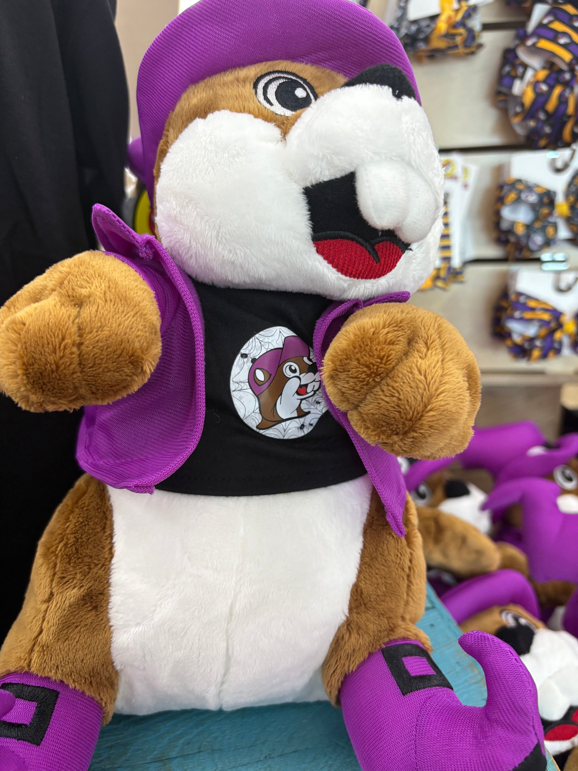 Celebrate Halloween with the Limited Edition Buc-ee's Beaver Plushy 2025, a 14-inch soft and cuddly collectible. This detailed figure features Buc-ee's iconic beaver dressed in a purple pointed witch hat, matching jacket and shoes, and a black T-shirt displaying a glow-in-the-dark beaver icon—perfect for adding festive charm to your collection or gifting to fans. Designed with expert attention to detail, this plush combines seasonal spirit with exceptional softness and quality.